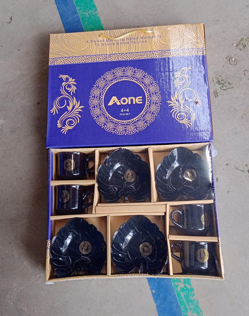 4 pcs Ceramic cup & 4 pc Plastic bowl 8-piece set of bowls and cups. Made from durable ceramic cup & plastic bowl, these stunning pieces are the perfect addition to your collection. Serve up your favorite snacks and drinks in style and impress your guests with their unique design.